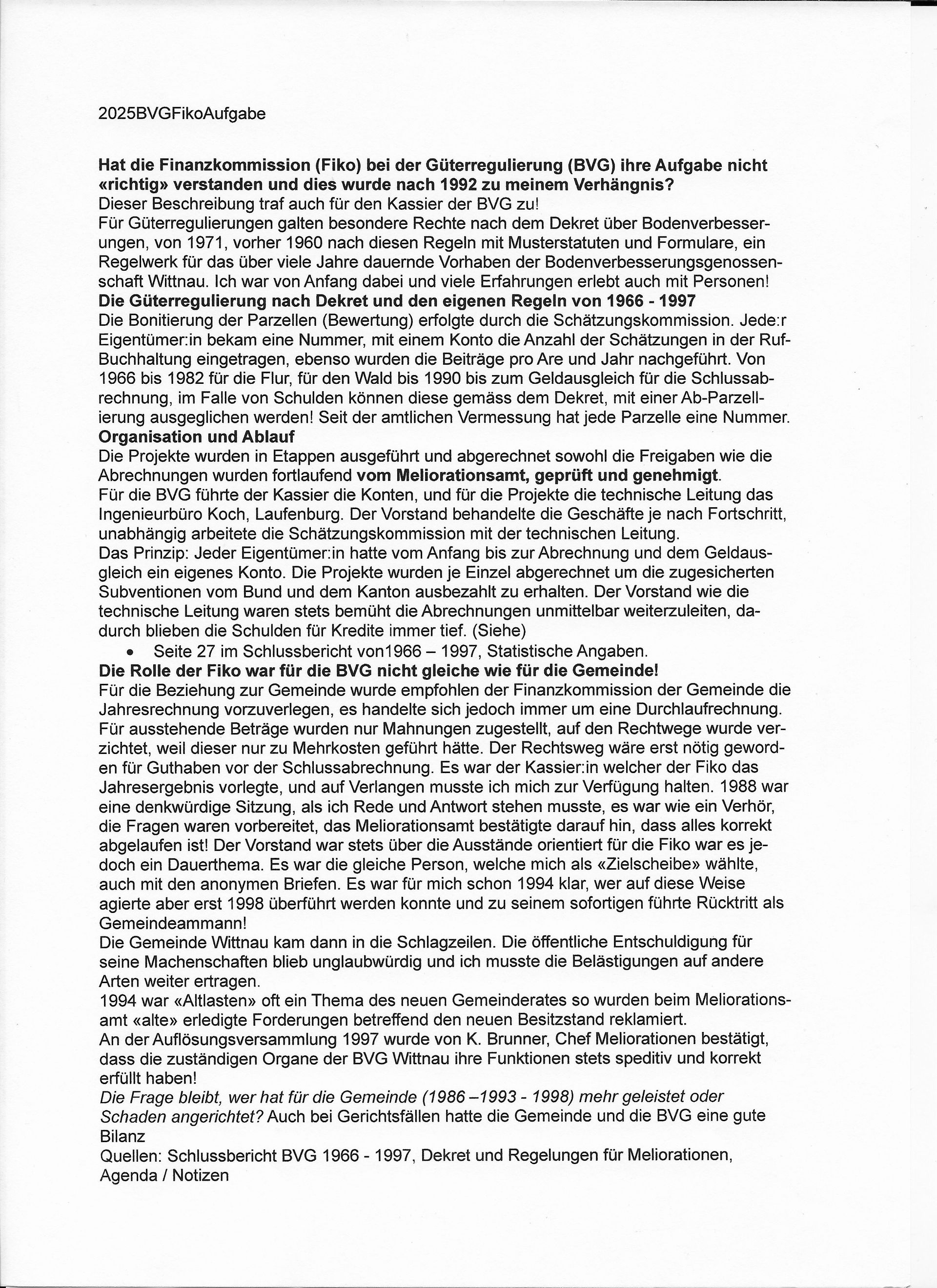 Unter dem Titel "Güterzusammenlegung Wittnau 1966 - 1997" sind in einem Bericht die Tätigkeiten der BVG Wittnau in einem 28-seitigen Bericht dokumentiert mit Bildern nachzulesen. Herausgeber: BVG Wittnau, Redaktion: Emil Hablützel, Widen Zusammenstellung, Layaut, Fotos: Kurt Bischofsberger, BVG Präsident, Gestaltung, Satz, Druck: Brogle Druck AG Gipf-Oberfrick, Pläne: Koch + Partner, Laufenburg.