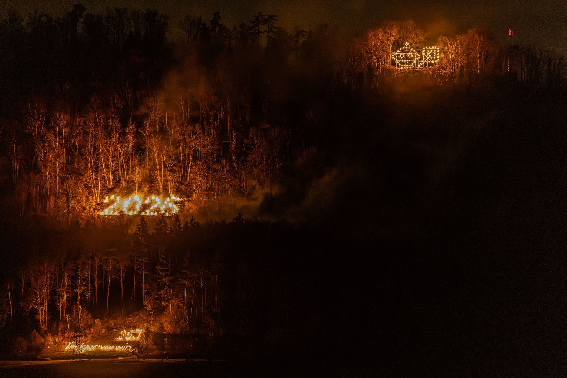 Bedingt durch die Convid-19 Pandemie wurden die traditionellen Fasnachtsfeuer für 2021 abgesagt. Unter Einhaltung der Regeln kam es trotzdem zu Feuerbildern. Die Jahreszahl durfte bei den "Untern" nicht fehlen. An der Flanke von Alt-Homberg , in der "Eiholde/Chalofe" leuchtete die Jahreszahl. (Bild Links)