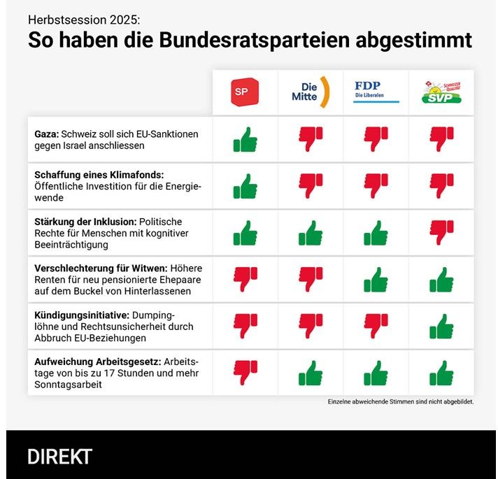 Die Abstimmungen für 2025 sind vorbei und die Herbst-Session im Bundeshaus ebenfalls, "direkt" zeigen wie die Parteien gestimmt haben, wie das Schema von links nach rechts zeigt. Immer bleibt die Frage auf welchen Einfluss hatte die "Die Mitte" und war eben mehrheitlich "Bürgerlich" und war bei der Abstimmung des Eigenmietwertes ebenfalls so.